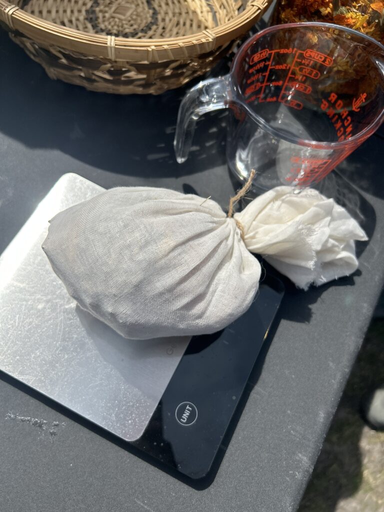 With the marigold, our first step involved heating 1 gallon of water until it reached 33.8 degrees Celsius with the goal of reaching a temperature of 37 degrees Celsius, akin to body temperature. This process required constant monitoring, as we alternated between placing the pot on and off the heat to reach the desired temperature and maintain that temperature. We then prepared a tea bag/ cheesecloth and filled it with 50g of marigold flowers before tying it securely with string. The combined weight with the cheesecloth and marigold measured to be 62g, and the actual marigold content was 50g before being tied with a cheesecloth. We also measured the Jacobs wool at 100g of wool, with a width of 1.88 millimeters.