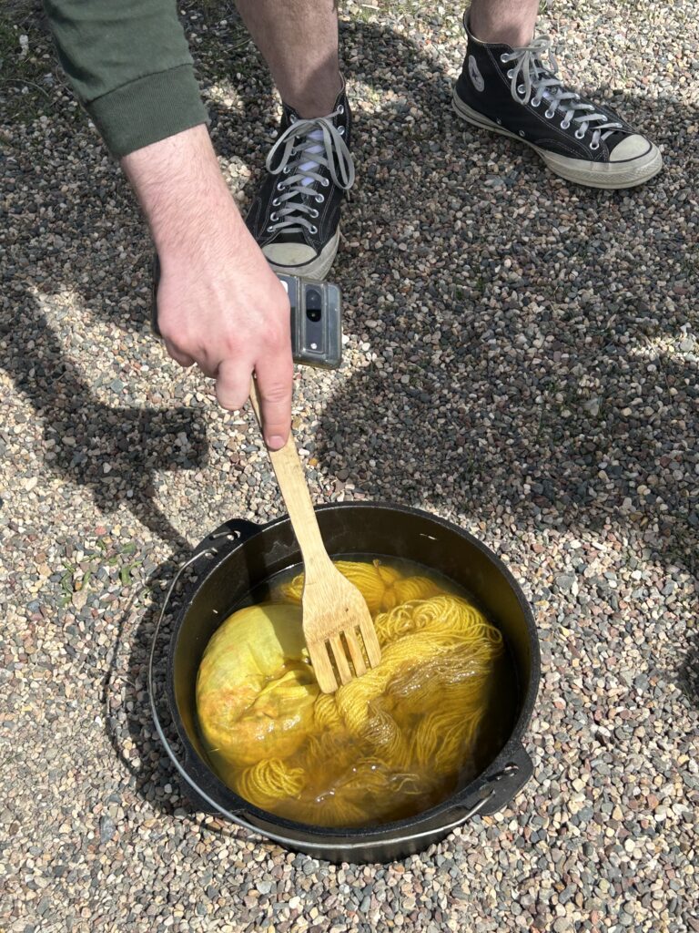 Once the marigold was securely tied in the cheesecloth and the water reached the optimal temperature, we submerged the marigold into the pot. Gradually, we noticed the yellow dye began to seep from the bag, tinting the water a shade of yellow. We allowed the marigold to steep for approximately 10 minutes until the water turned distinctly yellow. Then, we put the jacobs wool into the mixture to make the wool. I performed a dip test to see how the color adhered to the wool and it was pretty immediate. The wool was then left in the pot over the heat for the next hour. The temperature of the water mixture was 24.9 degrees Celsius when the wool was first put in the pot.