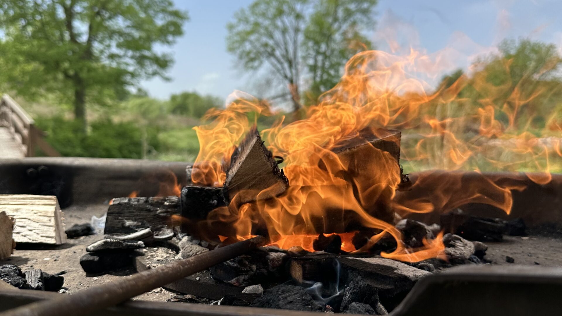 The difference in time in how long it took to begin squaring off the nail between the two nails is due to difficulty heating the metal and keeping the fire going. While making the first nail we had more wood already chopped into smaller pieces and ready to be put in the fire, so we were able to feed it continuously. While making the second nail, we had used up all of our previously chopped wood and the majority of the logs left were too large to fit into the wood splitter. Because of this, we had to burn the larger logs, which took longer, and so the fire took longer to heat the metal to the point that it could be shaped. Generally, the second nail was being hammered at a cooler temperature, which we were able to tell by the color of the metal, which meant that it took more heats to craft it into the desired shape.