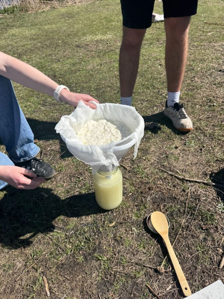 This procedure was the ideal process for making cheese; however, not every group was able to follow it. Some groups lacked consistent access to a thermometer and, as such, would sometimes overheat or underheat their milk mixtures. Overall timing also varied between groups as each group had a different fire, which heated at different rates.