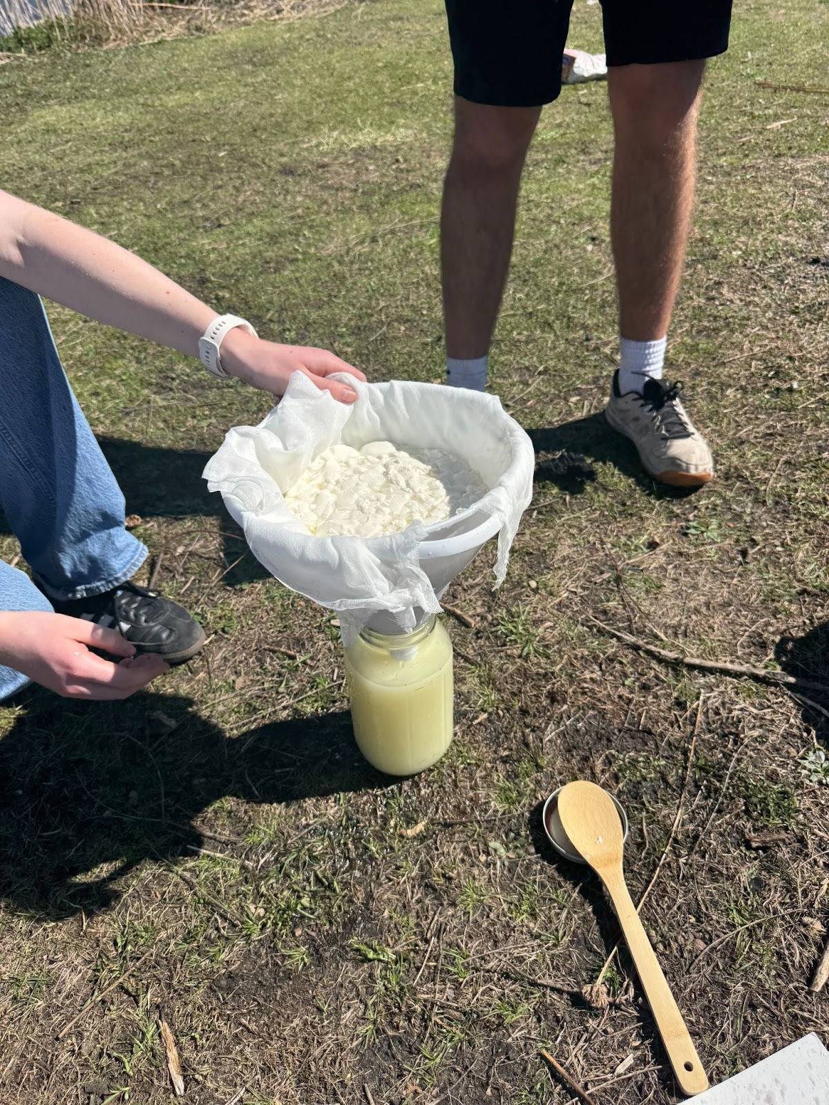 Group 4: Group 4 stood out for having a uniquely shallow fire pit, which resulted in slower but more even heating and an unusual curd structure where the curds sank to the bottom rather than floating on top. Their mozzarella was so well-received that people began eating it before it could be weighed, earning the comment “Your mozzarella is the BEST I’ve EVER seen!” from Jake. The ricotta effort was less successful: a combination of the shallow fire running too hot, a miscalibrated thermometer position (too high as whey depth decreased), and eventual boiling disrupted the process, yielding only about 170 g. Despite the ricotta challenges, the group estimated roughly 600 g of total cheese product from ~4,300 g of milk, or about a 1:8 cheese to milk ratio.