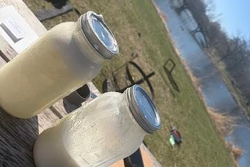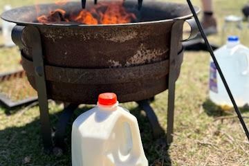 Each group mixed the water, milk, and vinegar in the dutch oven and heated it over a wood fire until it reached 90 degrees Fahrenheit. At 90 degrees, each group added a mixture of a dissolved rennet tablet in water to their heated milk.
