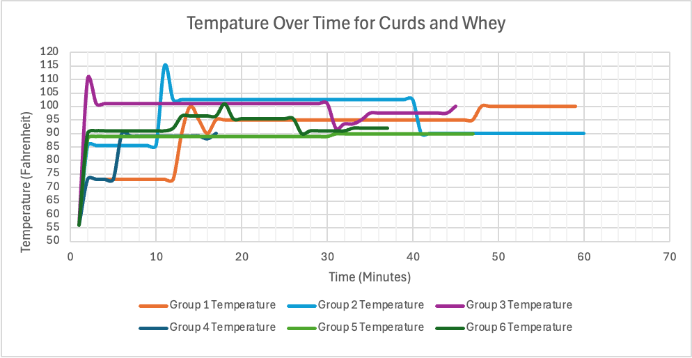 This chart shows the temperature over time of each group’s milk as they made curds and whey.