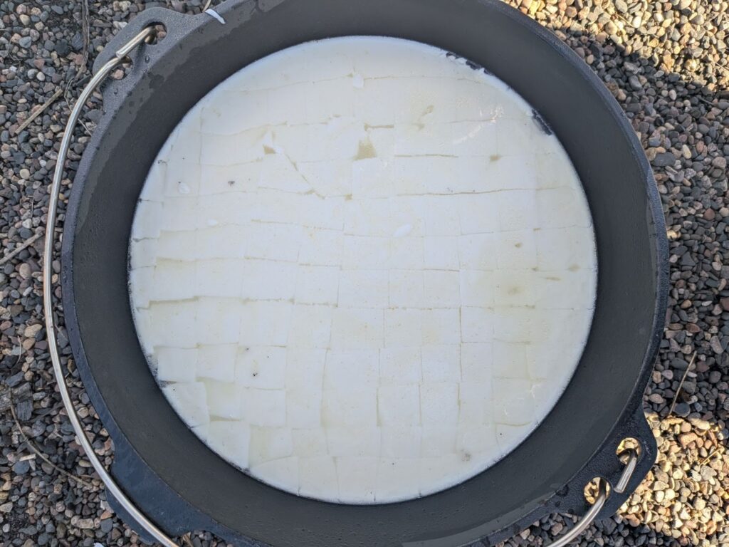 Once curds formed at the surface, a slotted spoon was then used to flock the edges of the curd layer towards the center, which condensed the curds on the surface as well as brought more curds up from below. The dutch oven was then removed from the fire if it had not already been.