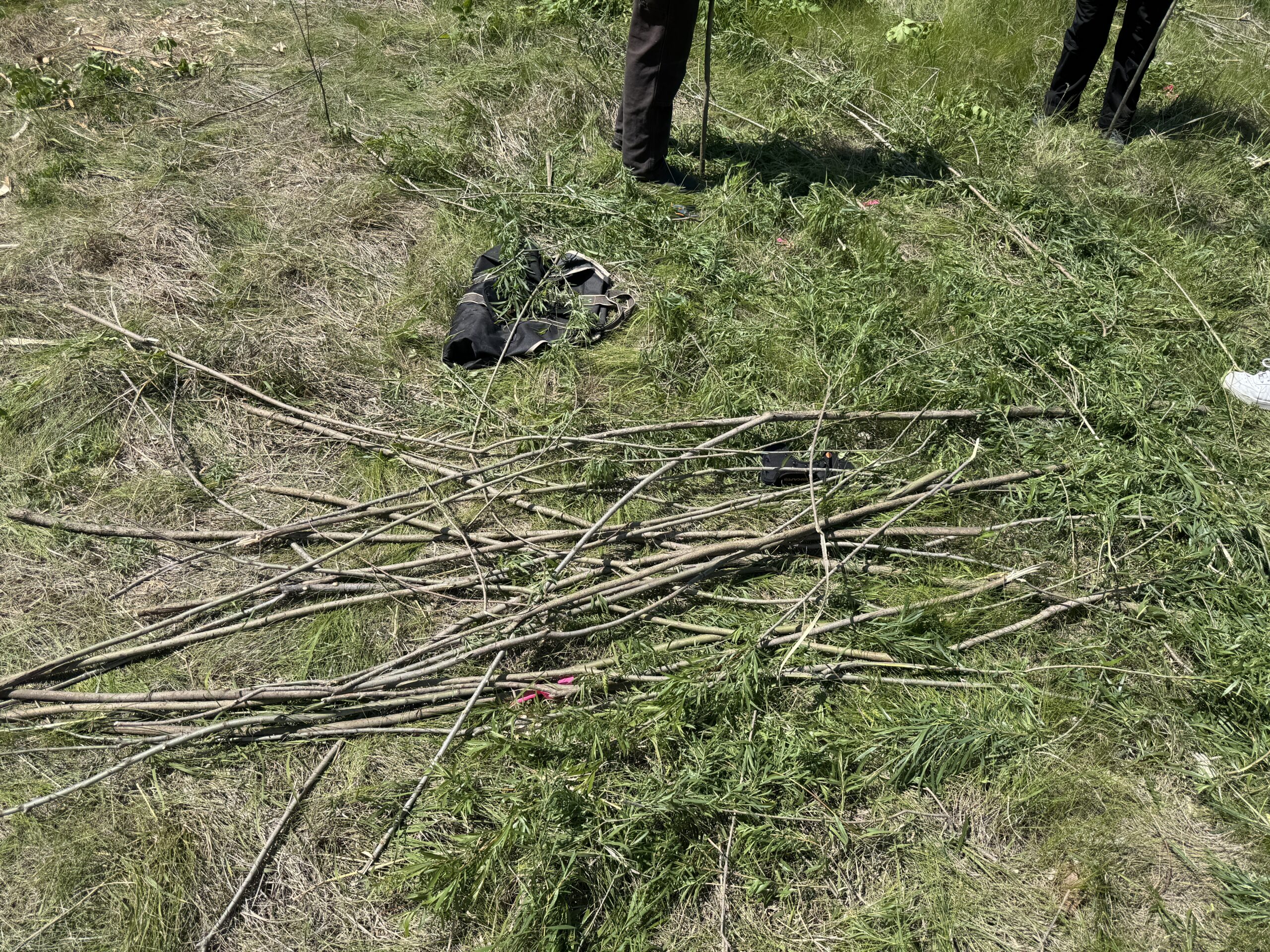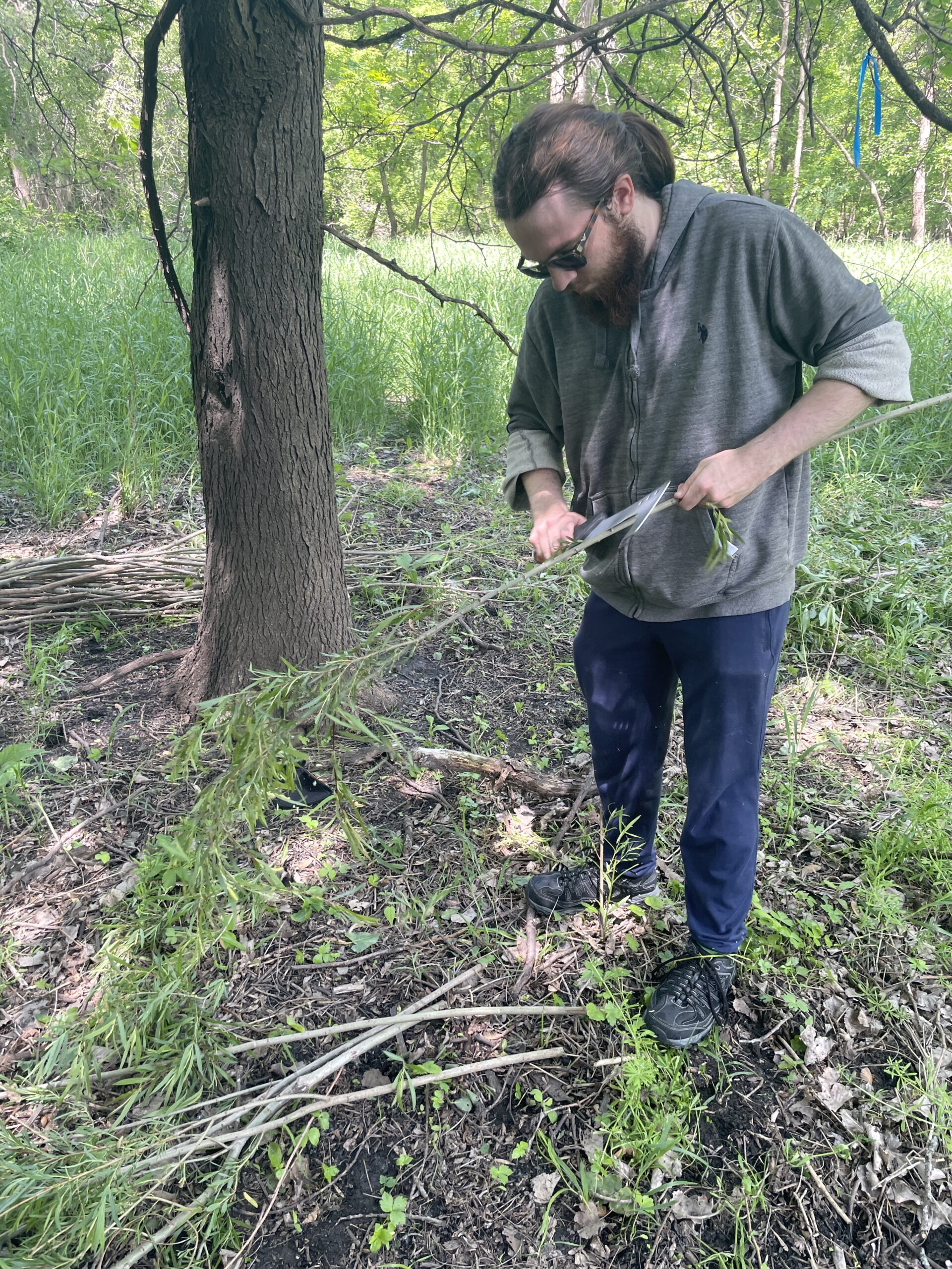 Before the lab started, we moved tools—billhooks, loppers, saws, shears, and buckets—into place near our construction site in the field of the old tennis courts down by West Gym. This lab marked the first time we had to gather resources from their natural state; before, we either started with pre-processed materials, as with the spinning lab, or got raw materials from someone who had collected them for us, like we did for the cheesemaking lab. So the whole class set off down the Lower Arb trail that follows along the Cannon to cut young willows. While many of the groups found stands of willow saplings, some had less luck and improvised, instead taking saplings of aspen and other kinds of flexible trees. Each group cut 36–40 rods, each about a thumb’s width, as well as six thicker poles, each two thumbs wide, using a historically accurate billhook and a historically inaccurate pair of loppers. Any large branches were pruned away, and the saplings were carried or dragged back to the construction site. There we stripped off the leaves and continued with pruning, leaving the fairly straight rods for the next step of the process.