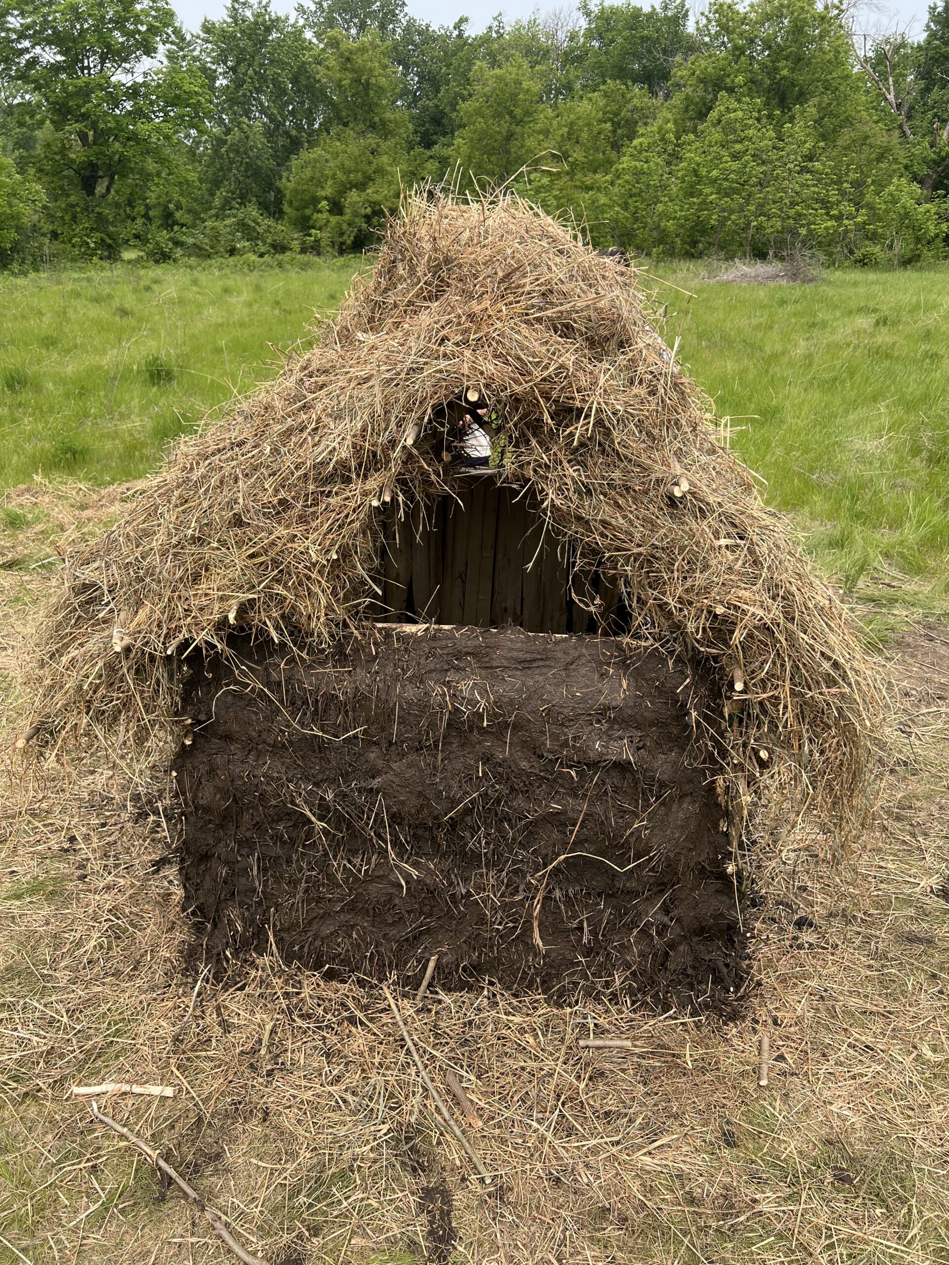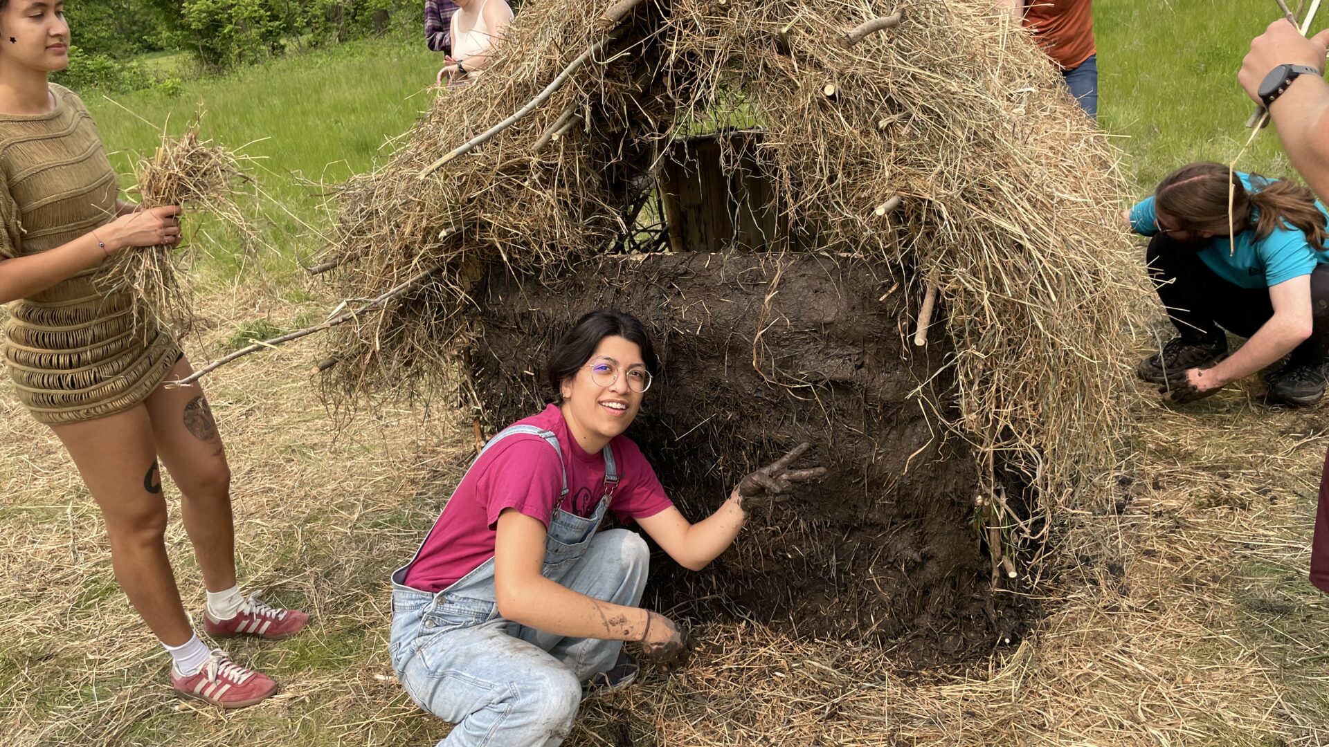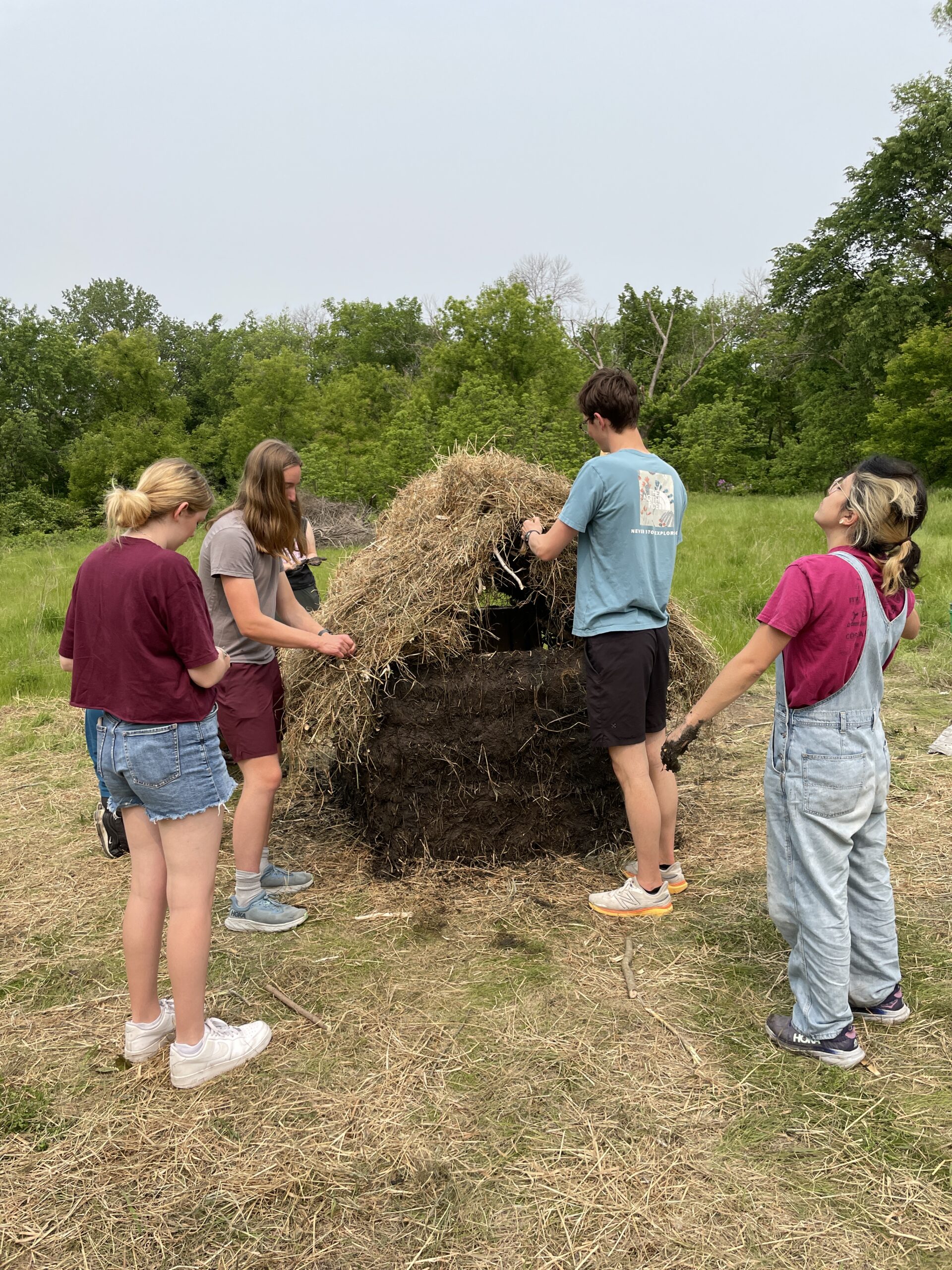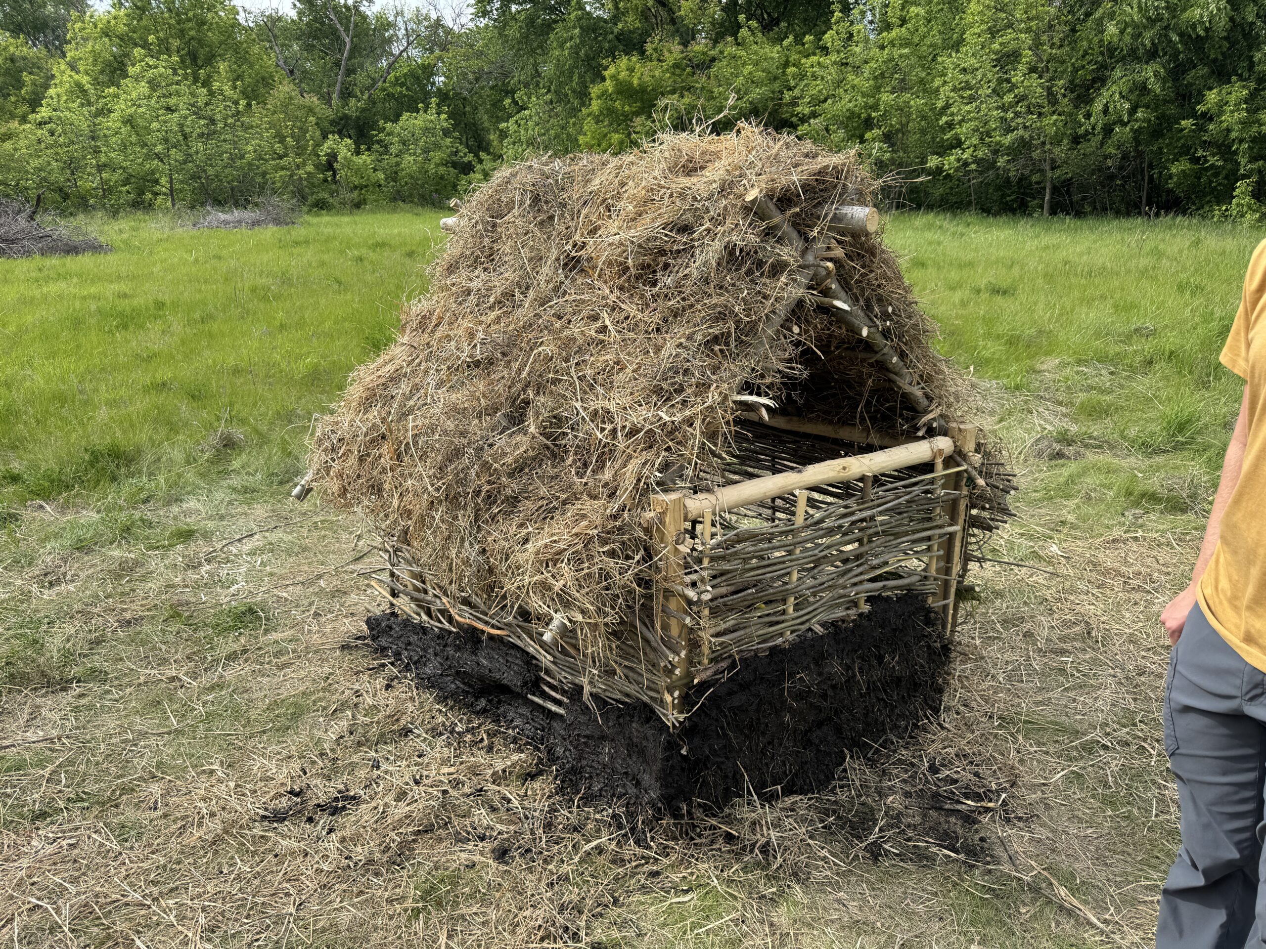 To increase the structural integrity of the walls and fill the holes left in them, a form of plaster was applied to the outside. This plaster was made of mud from the banks of the Cannon river mixed in with plenty of chopped and dried hay. The mud was collected by hand and with shovels, buckets, and wheelbarrows. The mud was then dumped on a tarp and mixed by hand with straw and applied to the exterior of the hut walls. The daub was applied from bottom-up, with effort put towards ensuring the hay fibers would become entangled in the willow sticks woven around the zales. This ensured that upon drying, the daub would not peel away from the wall over time.