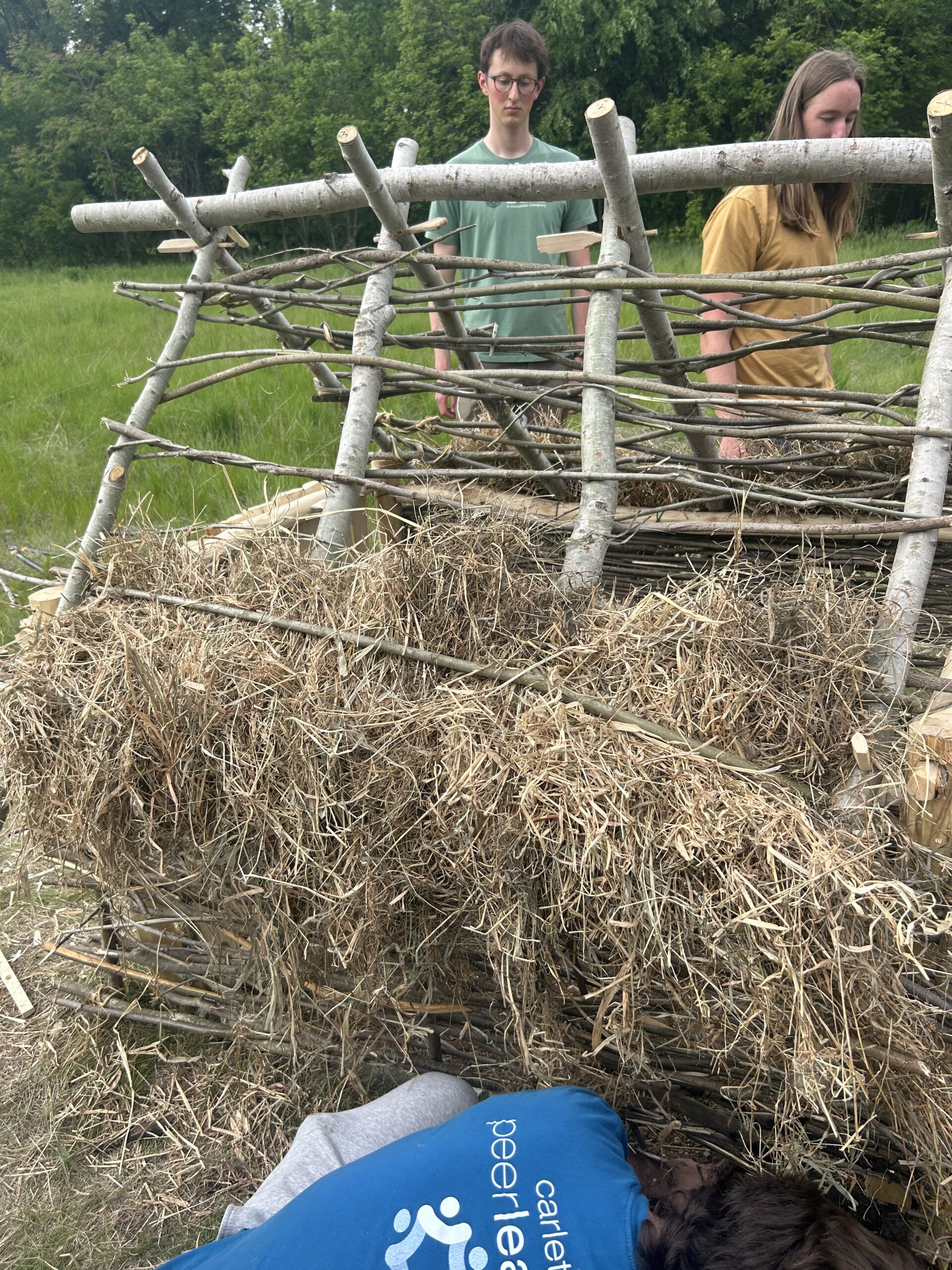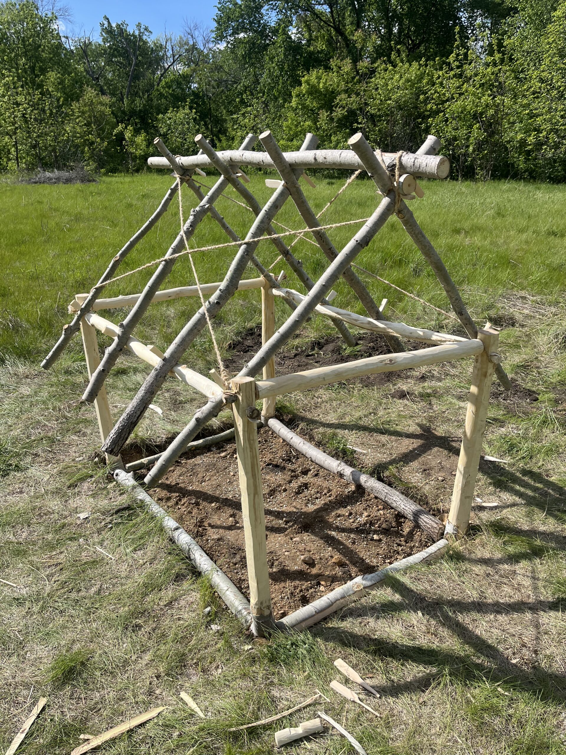 While rather simple on paper, many sets of hands were needed to ensure the zales were not moved out of place during construction and the sticks could be adequately twisted. Once the panels were complete and relatively straight, they were dry-fitted to the hut by hammering the zales into the ground just outside the hut’s frame. Ends that stuck out beyond the frame were trimmed with loppers.