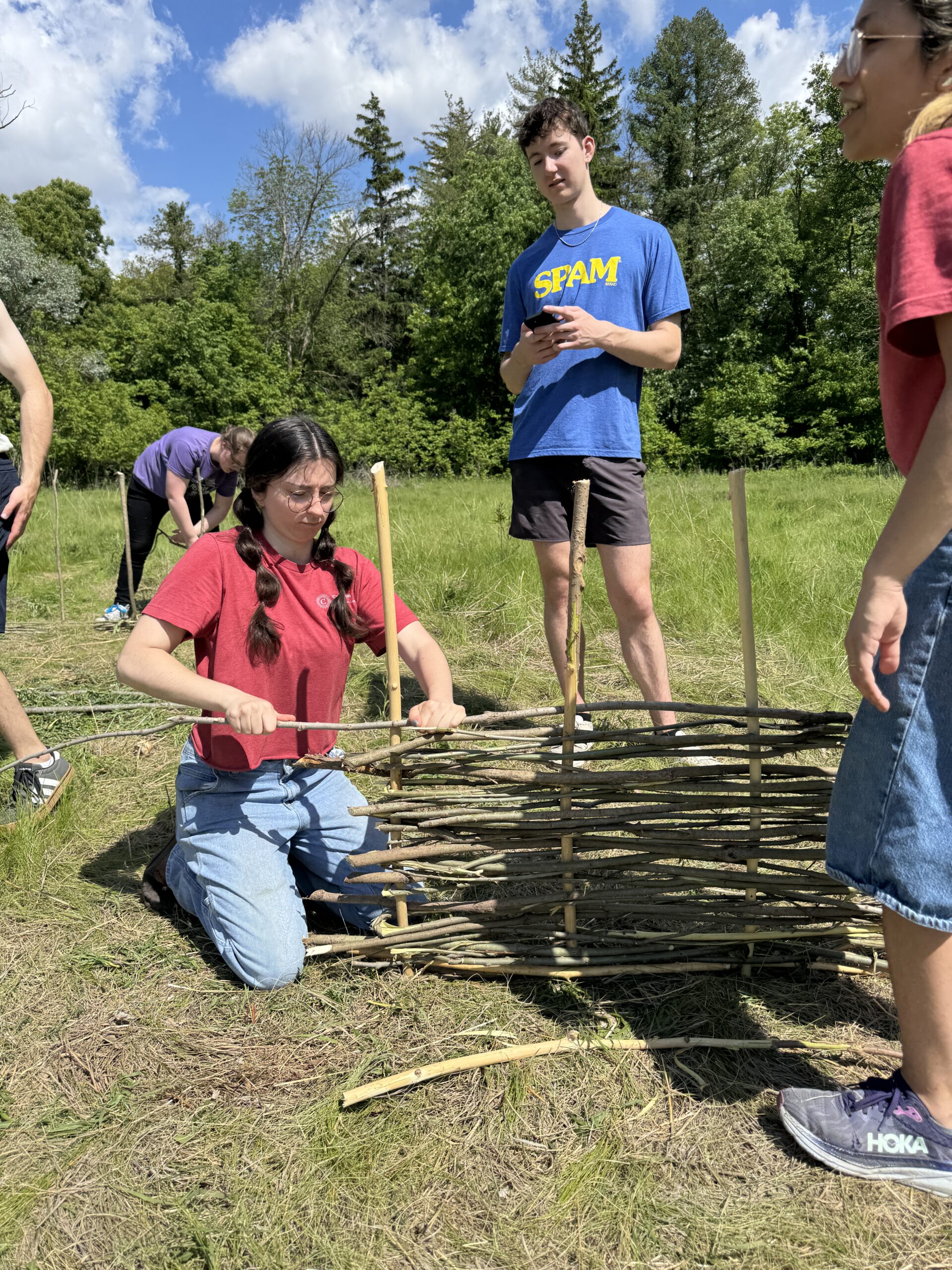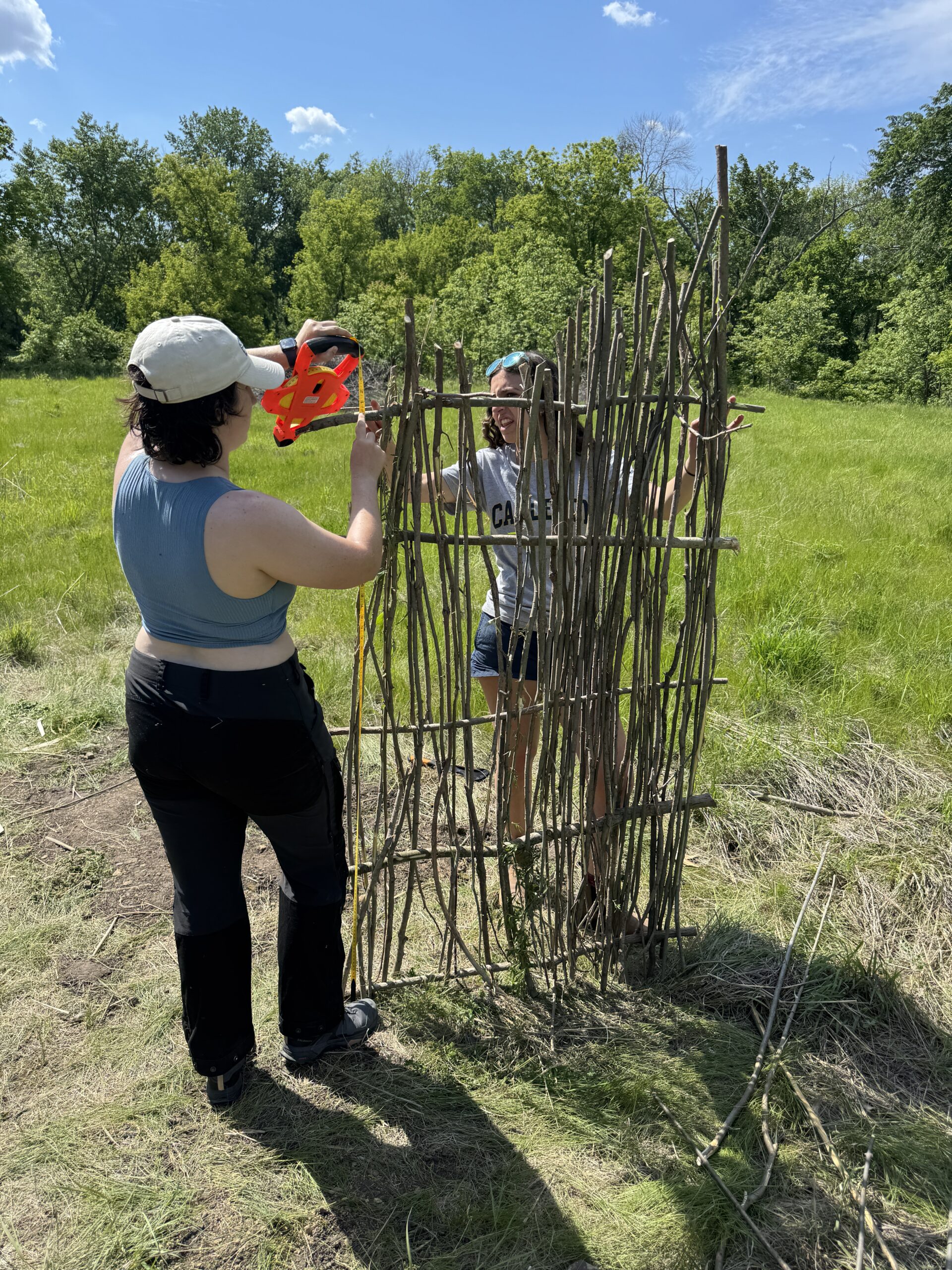 Groups A, B, and C constructed wattle walls from their collected sticks by hand. Wattle walls, also called hurdles or panels, utilize thicker poles (also called zales) as vertical guides for the thinner, more flexible poles to be woven around and through. The exact procedure was as follows: