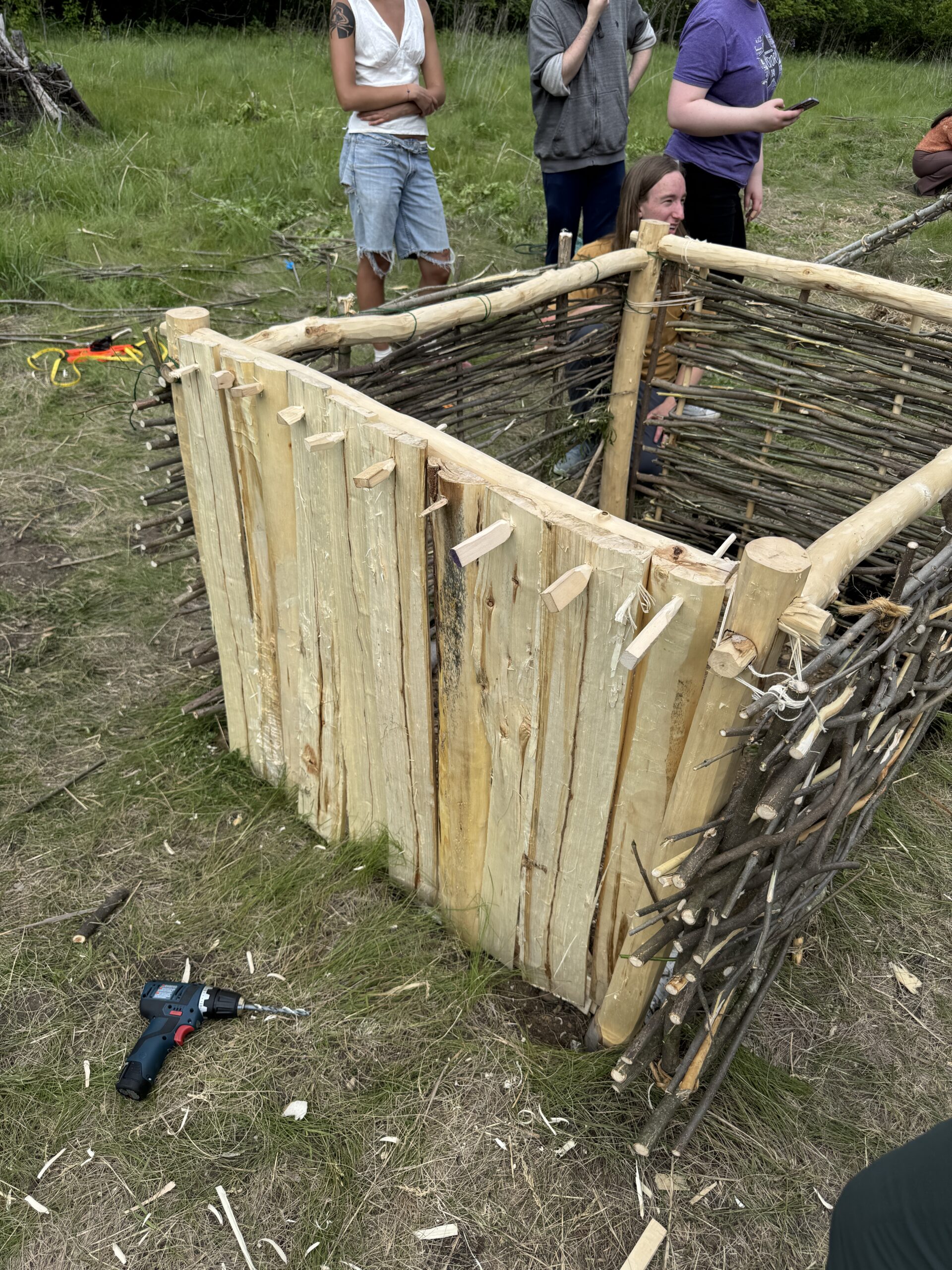 One wall differed from the rest, and was not constructed utilizing wattling, but instead was made of riven alder planks made during week 8’s lab. The planks were dry-fitted together, with the aim that gaps be minimized. The planks were then placed directly against the frame of the hut’s west-facing short wall, and secured to the frame through drilling holes through the planks and affixing them with wooden pegs.