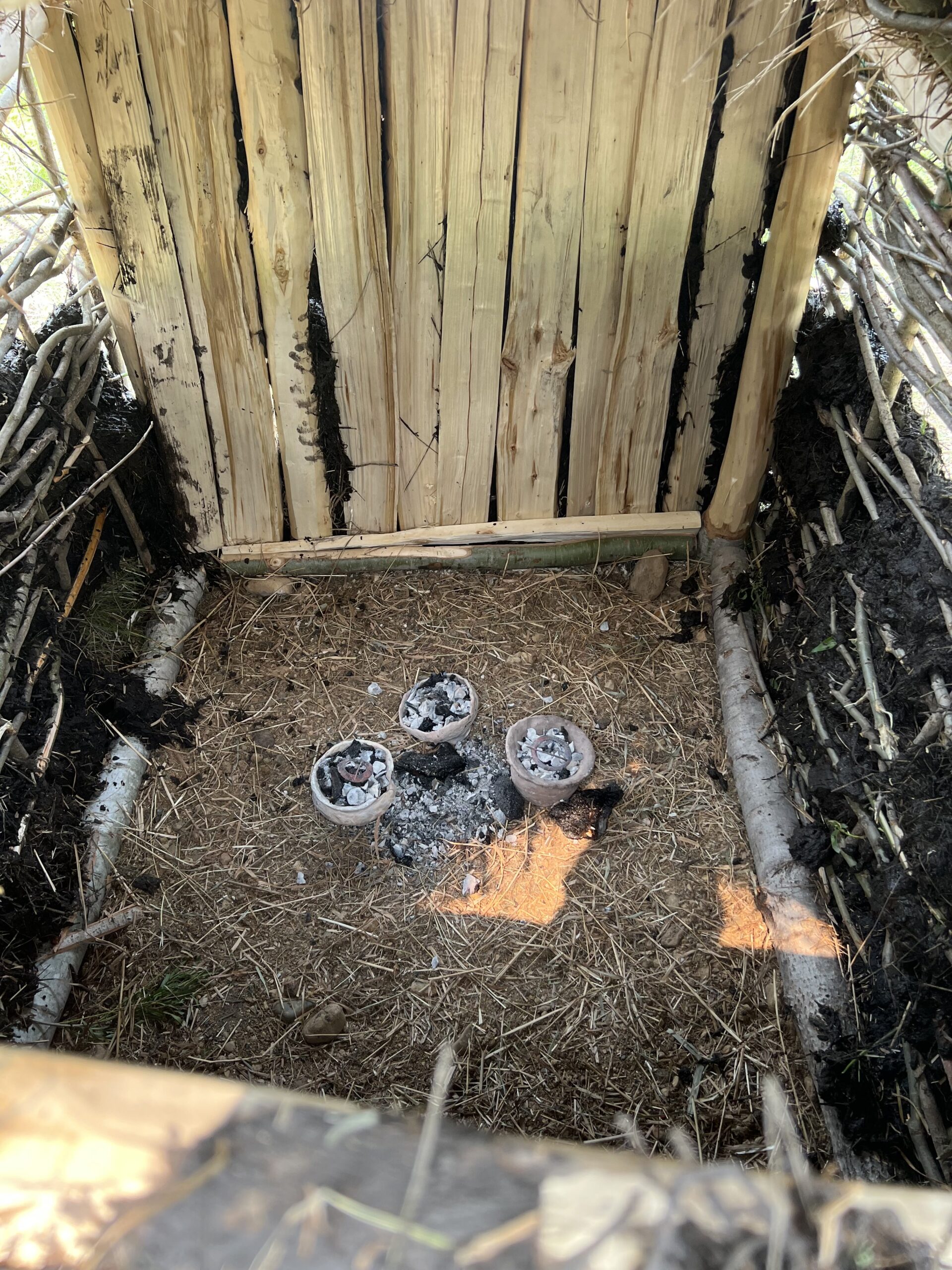While considerable progress was made during the Thursday lab, we were unable to apply daub to all four walls or finish thatching the roof. We returned for Friday’s class, however, and completed the construction of the hut. Upon completion, Austin gathered the class together for a ‘tomb-christening’ ceremony where the cremated remains were placed in the hut (most in pots made weeks prior, but there was also some loose ashes). Several people said a few words, but most of the class sat in quiet reflection. After Two Sixteen’s remains were placed in the hut, our quest to construct a mortuary hut was complete. The experiment is not technically over, however, as Austin plans to monitor the structure over the span of years to see if it is disturbed by outsiders (i.e. graffiti, grave robbing) and how fast the structure decays due to the elements, and what kind of traces it leaves behind.