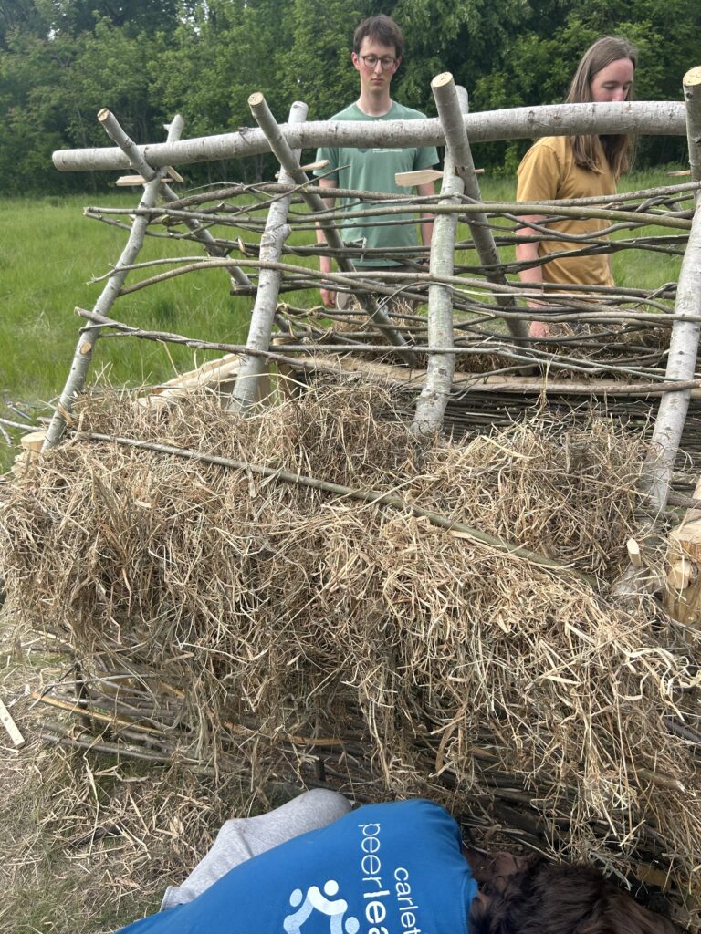 Last week, we built the timber frame of our Anglo-Saxon mortuary house. In this week’s lab, we finished construction by adding walls and a roof. Our overall goal was to experimentally reconstruct a four-post mortuary house, based on the outline of post holes discovered around cremation deposits at Apple Down in Sussex. There were several smaller goals, as well, which related to wood processing and exploring the transfer of skills between weaving and wattle architecture and joinery. In addition to learning more about the materials we were working with, one of the lab’s primary goals was to observe the emotions and reflections building a mortuary hut might inspire in us as participants.